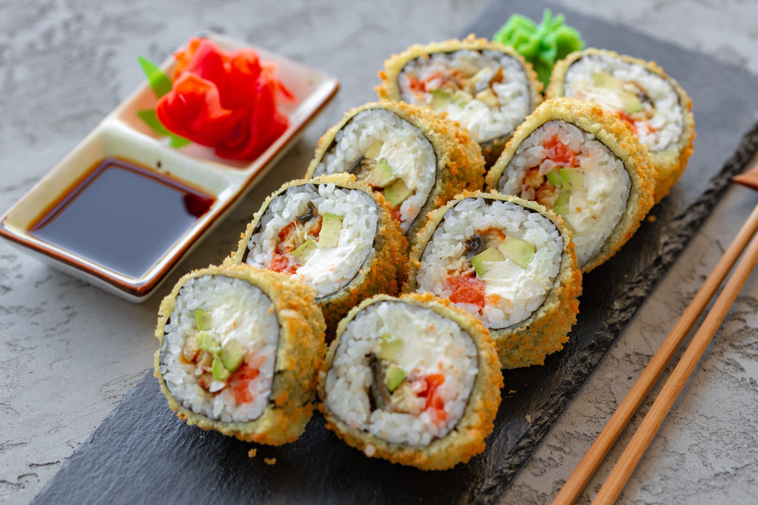 - 10 piezas cubiertas en sésamo (kanikama, queso, palta)