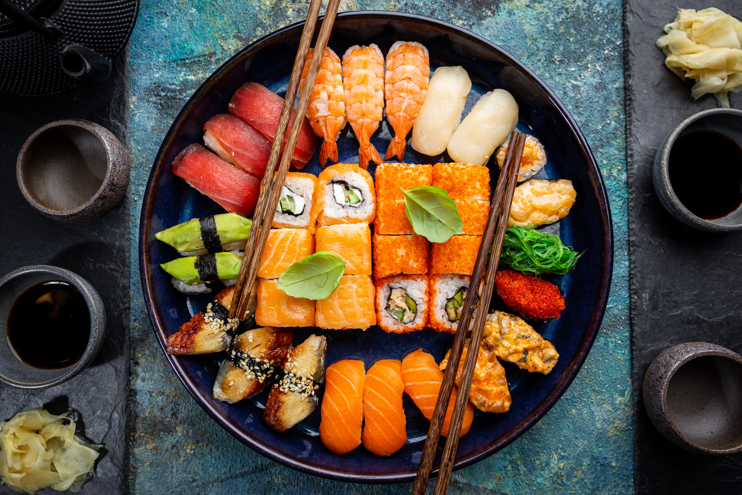 - 10 piezas cubiertas en salmón (camarón, queso, cebollín)